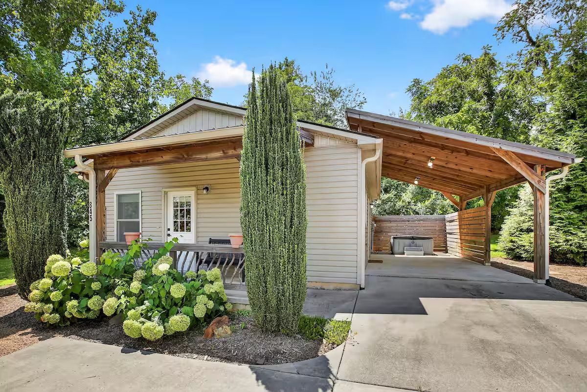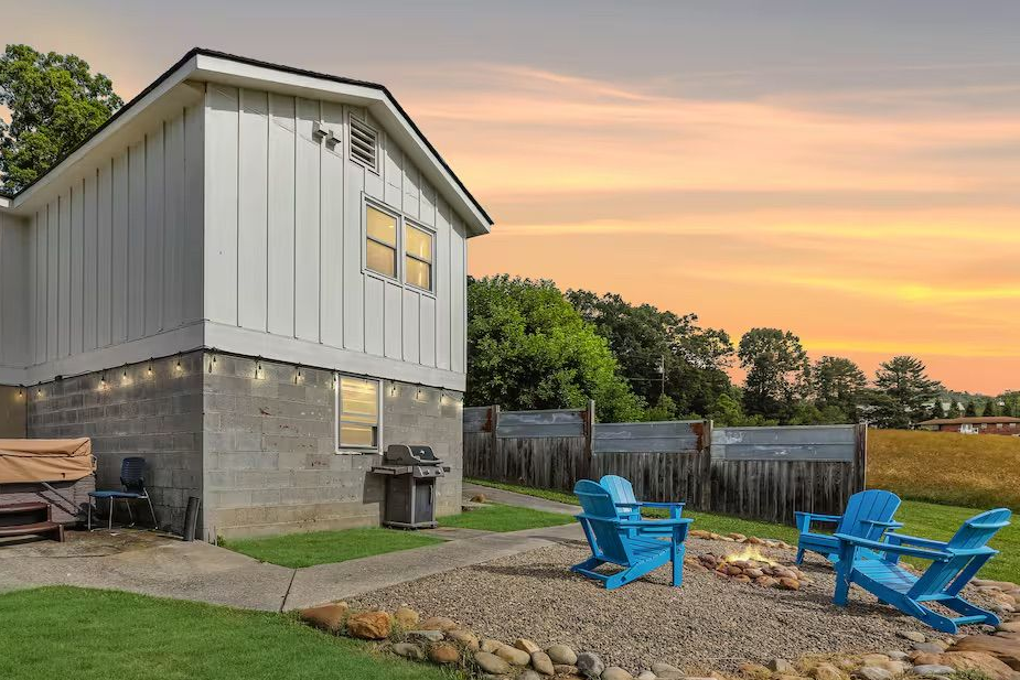 Modern, cozy couple’s retreat with a king bed, hot tub, and hand-painted sunset mural. Minutes from downtown Asheville, yet peaceful and private.