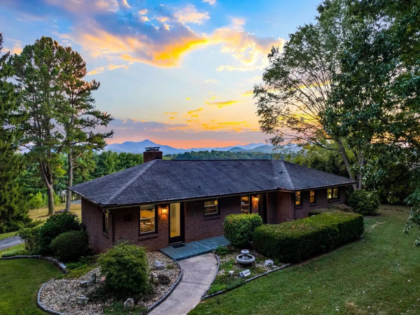 Mid-century modern brick home with stunning Blue Ridge views, hot tub, fire pit, and a game room. Stylish updates throughout for comfort and fun.